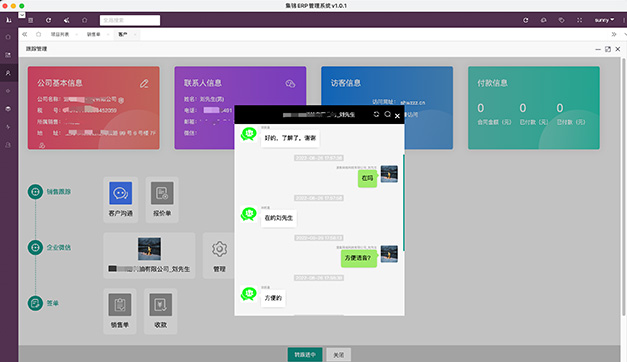 對接企業微信,銷售人員與客戶聊天數據(包括文字、圖片、附件)存儲ERP云端,并支持查看搜索。